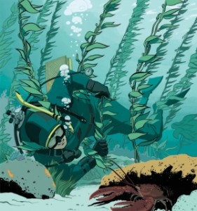 杰克看到一只大龙虾在空旷地带,他扑向它。但当他向前移动时,他感觉到有什么东西把他拽住。他没抓到龙虾,看着它被吓跑了。杰克扭过头,看看有什么东西拽着他,但没有看到任何东西,他又向另一边转身。每次转身,更多的海带缠住了杰克的身体和他的装备,他的脚蹼,他的调节器软管和他用来存放他收集龙虾的袋子让海带变得越来越纠缠。