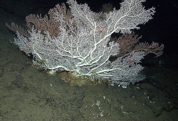 这是美印联合探险小组8月5日在大约4500英尺(约合1400米)深处的海山上发现的硬珊瑚。据美国国家海洋与大气管理局专家介绍,这个珊瑚的年代可能追溯至距今1000年至6000年以前。