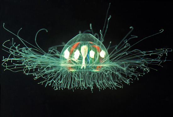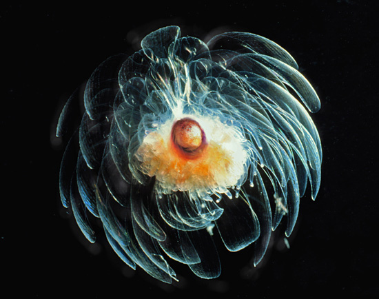 栉水母门曾经与刺胞动物门统称腔肠动物,但是目前已经分开。栉水母与水母外形相似,都是透明的,而且多是球型或吊钟型,依靠拍打身体周围的细小栉带在水中游动。当光线照射这些快速运动的栉带,会衍射出彩虹般的颜色。大部分栉水母还具有生物荧光,能自己产生光亮。另外,它们都是肉食动物,许多种栉水母会食用鱼类的幼苗,甚至因此严重影响近海的鱼类数量——包括图中这种5cm长的兜水母目Bolinopsis属动物。