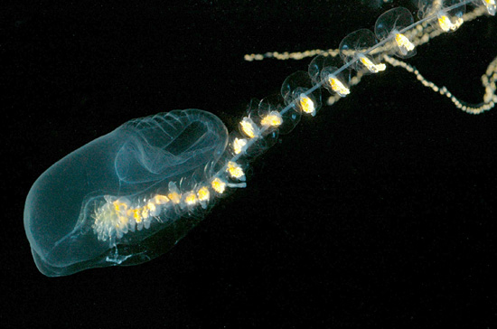 这张照片中的动物也是管水母目的一员,它是Rosacea属的一种动物。在2006年4月的马尾藻海海洋生物普查中,潜水员发现了这种美丽的生物。