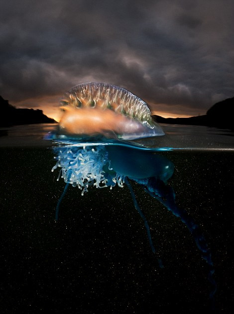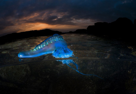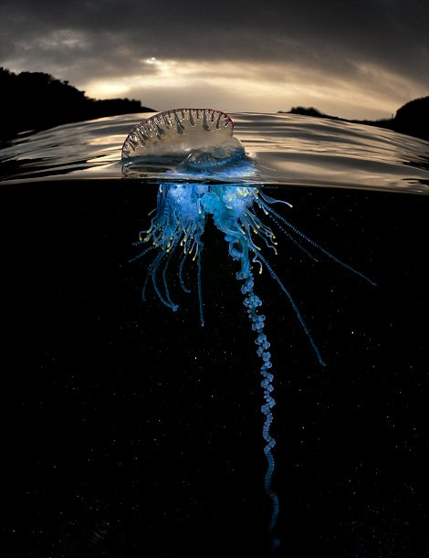 史密斯在澳大利亚新南威尔士州的Bass Point Cove拍下了这些蓝瓶僧帽水母的照片,他被它们颜色瑰丽的外表深深吸引,在史密斯的镜头下,水母的触角在夜色下的海水中发出绚丽的光芒,非常迷人,赋予其仿佛外星生物般神秘的色彩。