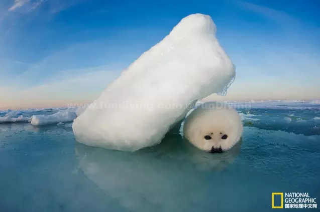 在圣劳伦斯湾,一头格陵兰海豹幼崽紧紧依附在冰上。2016年,加拿大允许以商业为目的猎杀40万只格陵兰海豹,然而由于海豹产品的需求下降,最终只有66,000只海豹被猎杀。