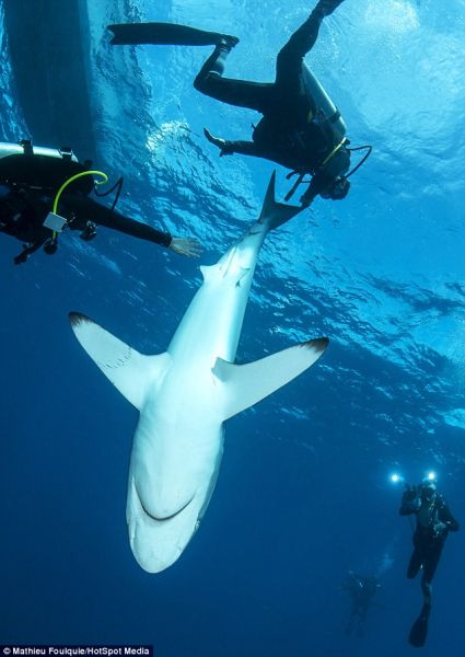 了让鲨鱼平静下来,照片中的的Jorge温柔地抓住鲨鱼的身体并让它呈垂直的状态。这一令人难以置信的的瞬间被来自法国的海洋生物学家Mathieu Foulquie见证。俩人在古巴的女王国家海洋公园里潜水时发生了如此奇特的事。