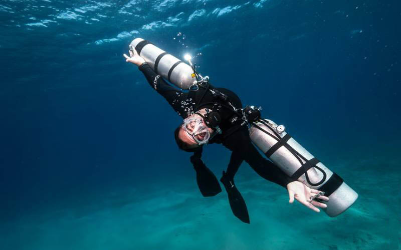 使用两支侧挂气瓶潜水,完全独立的气瓶和潜水供气。如果遇到空气不足或用完的问题,只要换用另一支即可。