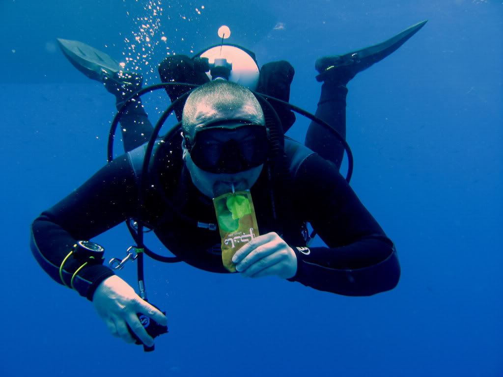 其实在大多数休闲潜水,并不需要在水下吃吃喝喝。然而,潜水时间越长,潜水员就需要带上零食或饮料来补充体能了。