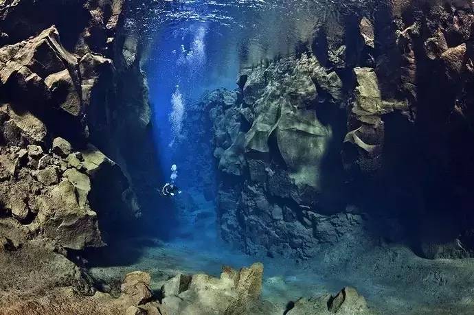 Silfra正是这样一个地处欧洲和美洲交界的大裂谷,潜入被海水掩盖的板块裂缝中,可以目睹大教堂般的裂隙形状,还有分隔地球地壳的缝隙。