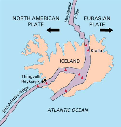 大裂谷是由于地壳运动产生板块漂移,大陆板块中不稳定的地方开裂,岩浆迸发出来而形成。位于大西洋中央的冰岛,刚好处于北美洲和欧亚板块的交界处,欧亚大陆犹如被大地之神高高举起,使得两大板块的落差有十多米。