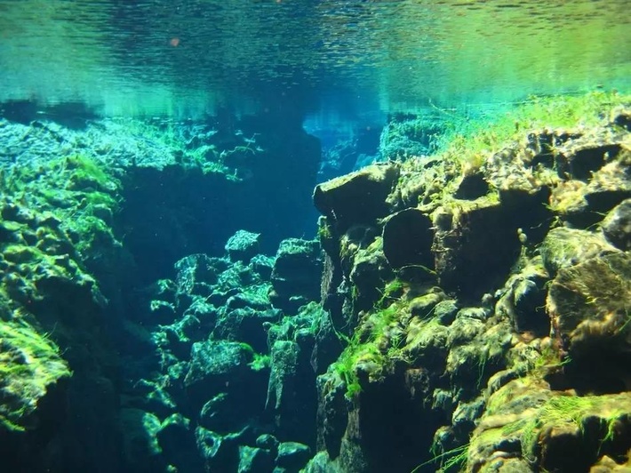 在这里,即使没有阳光,水底仍出奇地色彩鲜明,夹在两大板块中间,左边是北美洲、右边是欧洲,没有珊瑚和热带鱼,眼前只看见鲜绿色的海草,水清得连百米以外的东西都看得到,如果没有升空的气泡,还以为自己在太空漫步。
