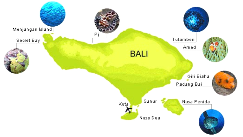 Menjangan (MJ) Island, Secret Bay, PJ(Puri Jati):MJ、秘密海湾和PJ。这里我们统称是在巴厘岛西北部,是Menjangan海洋公园地区。好比国内的西北地区,这里安静,远离巴厘岛广东繁华地区的喧嚣,在这里你能找到室外桃园般的宁静,当然,也是潜水天堂。