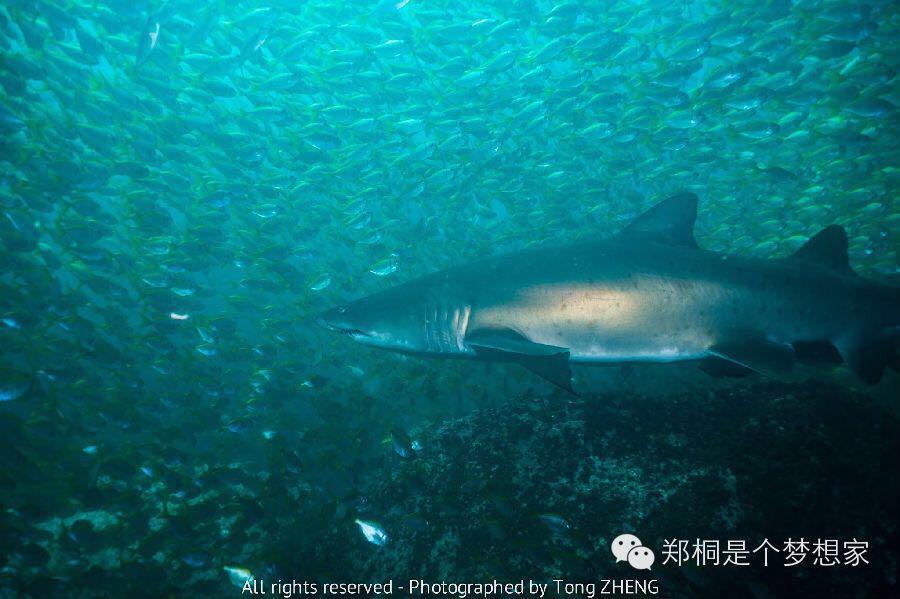 对于潜水员来说,Inner Rock虽然有无敌的能见度,但是底下真的除了石头东西不多,我们这次也是比较探索性质,不过不是很推荐。主要如果Looking Glass不能潜的话,North Rock可以作为一个不错的代替潜点。North Rock也经常可以看见大群的灰护士鲨 (Grey Nurse Shark),中国也叫做 沙地虎鲨,澳大利亚虎鲨。这种鲨鱼最著名的特征是侧面的斑点,以及龅牙。看起来很凶残,其实非常打酱油,完全对人没攻击型。但是还是那句话,Show Your Respect to Animals。所谓人不犯我,我不犯人。兔子急了还咬人,别说鲨鱼了。一般伴随着鲨鱼存在的就是这种大群的小黄鱼群,非常夸张的漫天都是,看到后简直不敢相信自己的眼睛。这次的照片在底下,虽然没有第一次去的时候的Looking Glass好,但是也勉强能看。