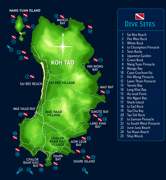 由于水下资源的丰富,并且有赖于泰国政府禁止渔民在涛岛(Koh Tao)近海捕鱼的规定,所以单单围绕在涛岛(Koh Tao)周边的潜点(dive site)就有25个之多。(上图红色小框,是潜水地图中潜点位置的专用标示)。在这些潜点中,大部分贴近岛外的潜点都是水流温和、情况简单适合所有课程(初级、进阶、专业)学习的教学潜点。当然也有很多适合进阶和专业潜水员探险的advanture site。