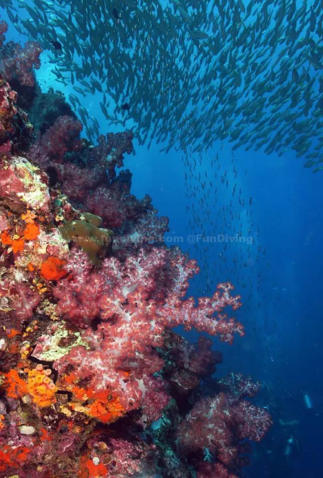 大部分潜水员来斯米兰的主要目的就是这个潜点了吧!潜点位于泰国Andaman海最北部的素林国家公园,往北不到5海里就是缅甸海域。潜点形状像马蹄形,在低潮的时候潜点最高处的礁石会露出水面大约1米左右,涨潮时则淹没在水下。你能看到各种颜色的软硬珊瑚生长在珊瑚岩上面,各种鱼群穿梭其中。最为著名的就是软珊瑚,它们密密麻麻地像地毯般覆盖了几乎整个潜点的珊瑚岩,美轮美奂。生活在这里的鱼群们也是数以万计,海狼群,杰克鱼群,大眼鲷鱼群与沙丁鱼群都有可能遇到。由于靠近外海,在每年的2到4月份之间还能经常看到路过此处的鲸鲨。这个潜点排名泰国第一,当之无愧。