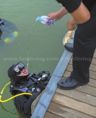 训练间隙,水下特警靠岸喝水。