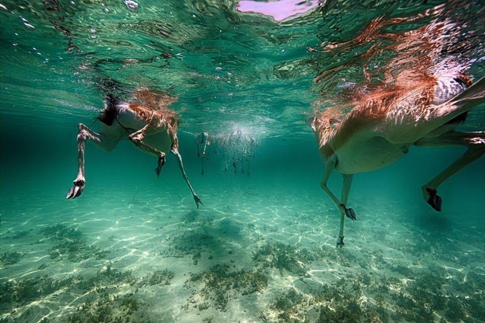 阿里等待了好几天的时间才拍摄到砂瞪羚(Sand Gazelles)在浅水区游泳的画面,他称这种沙漠动物是个真正的游泳健将。