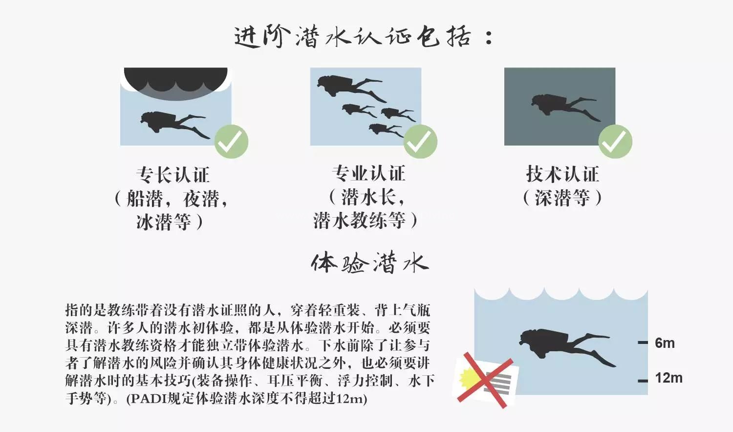 不同的潜水组织队员潜水证书也分为了不同的等级,正如钢琴、小提琴、英语等考级一样,不同等级的证书代表着不同的能力。拿最为普及的PADI为例,比如,开放水域初级潜水员,是在没有专业人士督导下潜水的最低级别证书,年满10岁以上即可报名学习,开放水域潜水员水深限度为18米,即最多可潜至水下18米。)