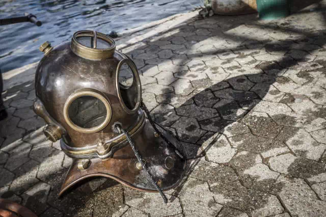 在穿好潜水衣后,这只沉重的铜质头盔将被用螺栓与衣服扣住。最后,头盔中央直径约为20厘米的视窗在下水之前也将被锁上以防进水。