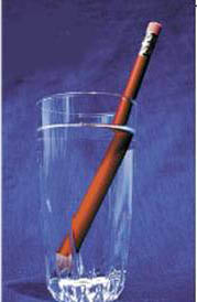 尽管带了潜水面镜,由于水的密度是空气的800倍,视觉还是要失真的。光波从空气进入水中的时候,会减速,弯曲或折射。在水杯中插入一支铅笔就可以说明这一现象(见图)。注意铅笔在空气与水的交界处有交错,弯曲的现象。