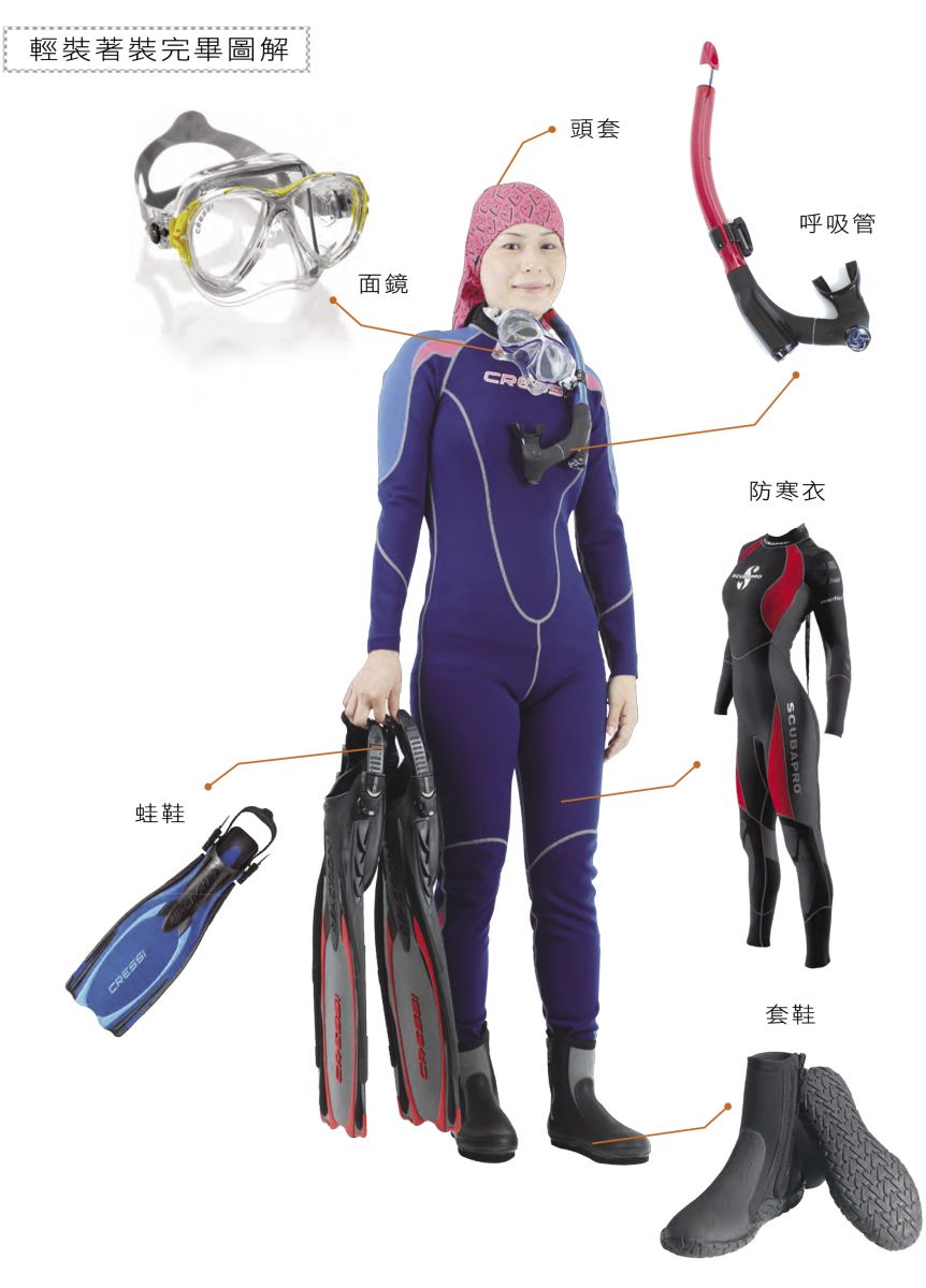 轻装的范围包含,面镜、呼吸管、防寒衣、手套、套鞋、蛙鞋、配重。而其中的防寒衣、手套、套鞋属于半消耗品,会因为使用时间及次数增加而影响穿着的舒适性,通常 3-5年可能需要考虑更换。至于其他的轻装只要好好保养使用的期限都很长。