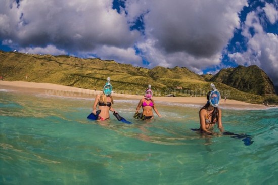 以前带有橡皮牙垫的潜水面具过于笨拙,如今该公司推出的这款全脸覆盖潜水面具,可适用于水下10英尺(约3米)的深度,使潜水变得更加舒适。