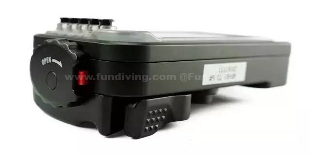 延伸器旁是电池仓,需放入两节七号电池。七号电池待机时间相对较长,能支持更长久的水下拍摄,设计给予潜水员最大的便利性。