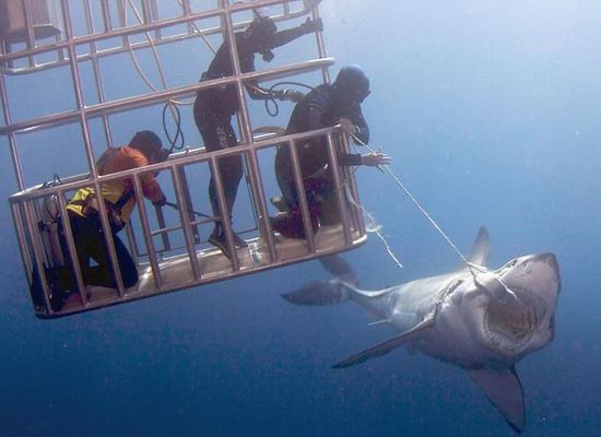 近日,在墨西哥瓜达卢佩圣母岛海岸,一名潜水员通过向大白鲨投喂食物将其引诱至笼子边,将他的手臂伸出,轻轻抚摸了大白鲨的鼻子。这一惊魂时刻被摄影师记录了下来。据悉,大白鲨通常可长达15英尺(约4.6米),重量则可达到5000磅(约2268千克)。2015年11月,曾有一名潜水员游到瓜达卢佩圣母岛海域,与被公认为世界上最大的大白鲨“深蓝”进行了面对面交流。“深蓝”年纪大约50岁左右,2013年开始出现在人们的视线中。摄影师曾公开过“深蓝”与笼子中的潜水员们嬉戏的画面。