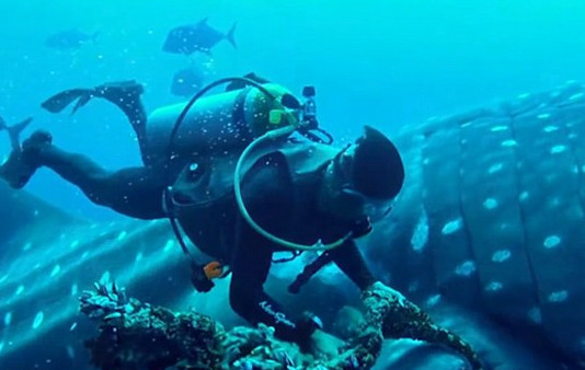 在墨西哥海岸几百公里远的索科罗岛的水中,一名潜水者解救了一条被绳子缠绕的鲸鲨。这条鲸鲨非常配合潜水员,解开绳子用时仅仅30秒。这个不可思议的过程被镜头记录下来。