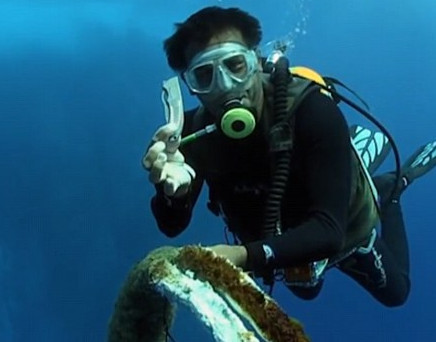 鲸鲨堪称地球上最大的生物,不仅如此,它们的寿命也较长(大部分都能活到七十多岁)。但是由于出生率较低,加上人类的猎杀和对它们栖息地的破坏,它们的生存也受到了威胁。图为勇敢的潜水者展示从鲸鲨身上取下来的绳子。