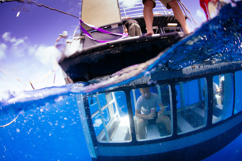 现在,如果你去南澳大利亚的Lincoln港,就可以坐进一种最新的Aqua Sub(玻璃潜水箱)里欣赏大白鲨。这种潜水箱可以容纳最多6~8个人,整个箱子的形状就像一艘小船,通体是透明的,客人先坐进漂浮在水面上的潜水箱中,待人坐齐后关上舱门,再慢慢地深入海中,在这个过程中,可以一边品尝美食、饮料,一边欣赏海底美景,还能邂逅经常出没在这里的大白鲨呢!