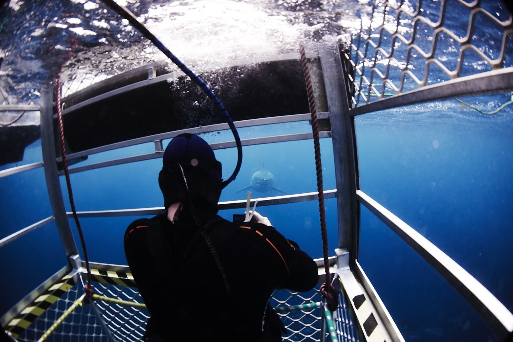 坐进玻璃潜水箱里,不用湿身就可欣赏海底的大白鲨。
