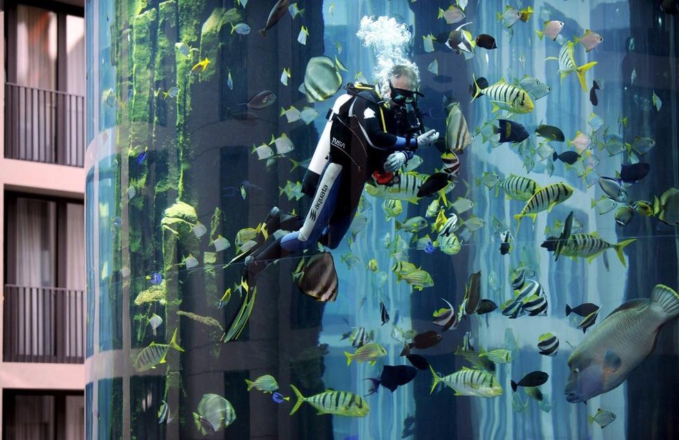 在德国柏林的雷迪森酒店,有一个世界上最大的独立圆柱体水族馆,高达82英尺(约25米,大约8层楼高)。