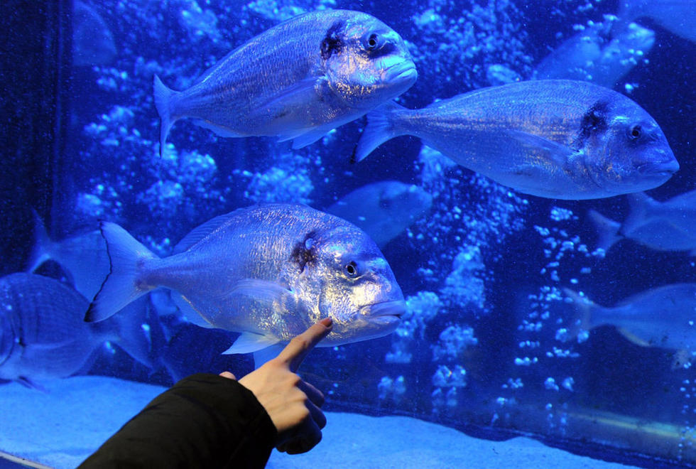一名游客将手指放到玻璃上,似乎是想逗逗面前的鱼。