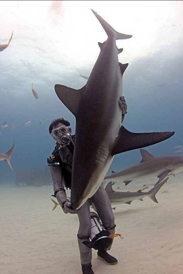 潜水员抚摸鲨鱼的鼻吻部让它们平静和放松下来,甚至可以让它们进入无意识状态以便研究者操作。