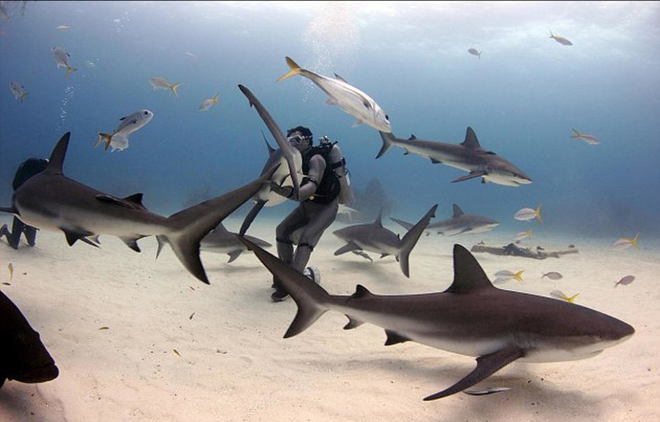 潜水员身旁有多达50条鲨鱼。
