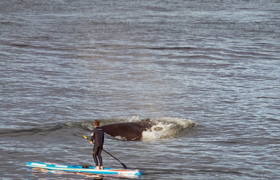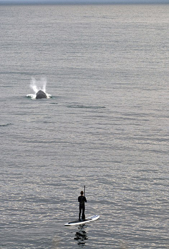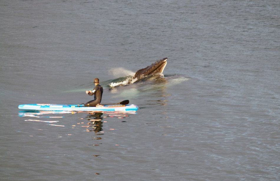 詹森和同伴在海滩冲浪漂移时,一头座头鲸突然在他旁边破水而出。