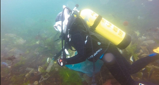 基隆市救难协会队员日前着重装备潜入海中捡拾垃圾。