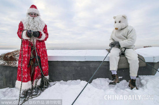 当地时间2014年12月22日,俄罗斯克麦罗沃,一名“圣诞老人”和一只“北极熊”使用绳索从高层建筑的窗户进入,为孩子带去欢乐。