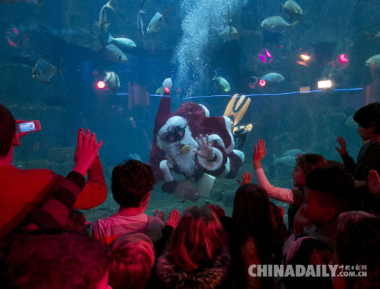 当地时间2014年12月22日,法国巴黎,水族馆的潜水员扮成圣诞老人的模样在海底畅游,与观众热情互动。