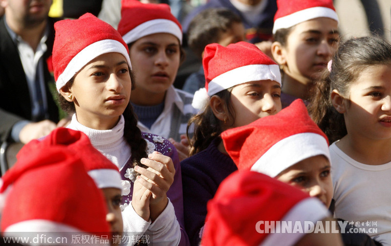 当地时间2014年12月24日,伊拉克巴格达,逃离IS攻击的基督教徒儿童,在一所用作难民营的学校里庆祝圣诞节。这些基督教徒来自摩苏尔地区,他们的家园已被IS占领,大约有1万至2万名摩苏尔难民逃离家园,他们大部分逃到库尔德斯坦首府埃尔比勒市和巴格达市。