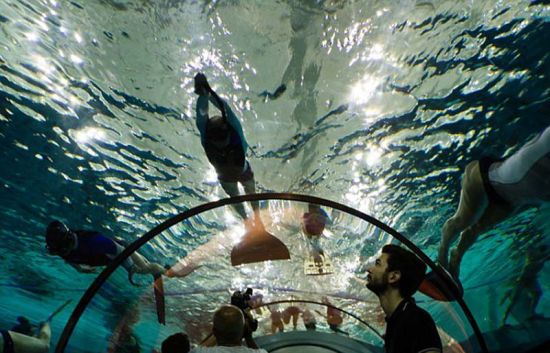 泳池中有完全透明的悬浮水下通道,不游泳的游客可不必湿身体验泳池乐趣