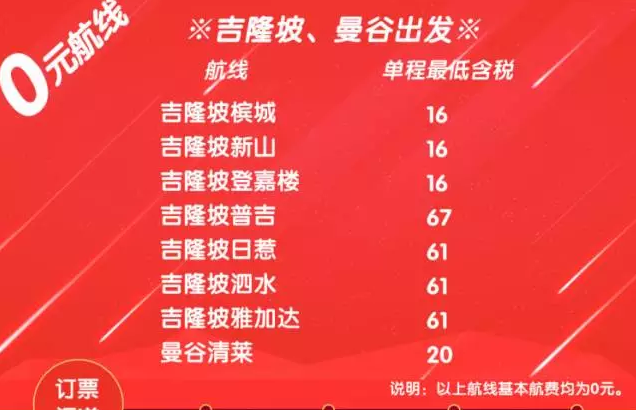O 元航线里的吉隆坡和曼谷出发的航线简直“丧心病狂”,居然低到了16元起,还是含税后的价格,而且这些机票的出行时间也都涵盖了国庆节、水灯节和泼水节,所以还是值得抢一下的。亚航这次大促来势汹汹,当然如果抢不到0元或1元航线的机票也不用灰心,还有其他稍微“正常”一点的特价机票。