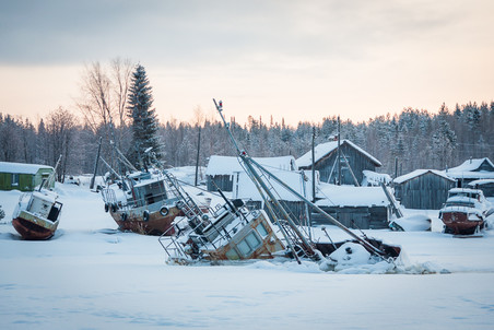 海湾靠岸的地方,到处都是被冰封的渔船