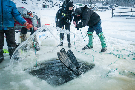 而实践上呢,冬天的冰层下,啥也看不见(≧▽≦)/,偶尔游来一两条小鱼儿罢了…不过真看到了大鳇鱼也不会有多高兴,看我的表情,我其实是在说:能不能浮上去了啊o(╯□╰)o我要去洗热水澡…