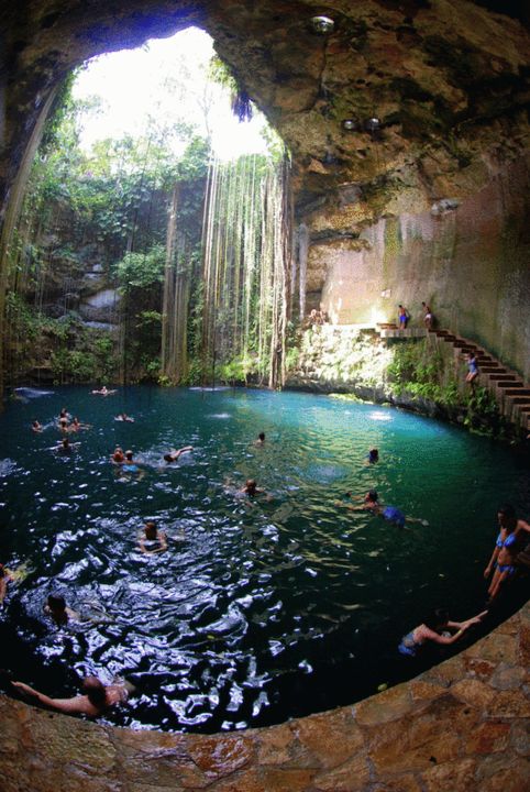 益吉天然井位于墨西哥尤卡坦半岛上的Ik Kil公园里,葱郁的植被覆盖着井口周围,井上垂着不少热带植物的藤须。当地传说中,这里曾是远古时玛雅国王和王妃们沐浴的私密场所。