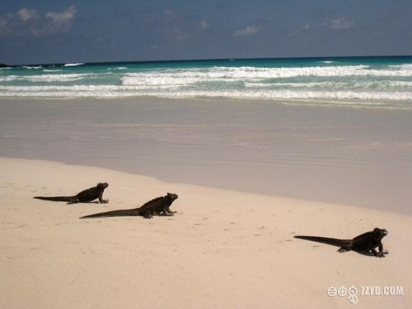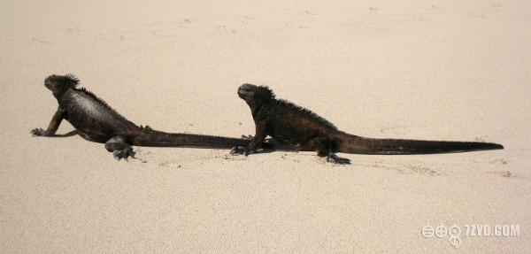 在船上的时候我就以现沙滩上,有一行动物的脚印。让我兴奋不已,我的老朋友,我的大蜥蜴.....我来了。岛上的蜥蜴有两种,海蜥蜴个大,是两栖动物,金蜥蜴个小灵巧,生活在树林里。登上Santa Cruz岛,看到的第一种动物是海蜥蜴。一群黑漆漆的海蜥蜴,趴在地上,有人靠近,也懒得去躲的样子,不断打着喷嚏。