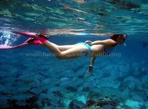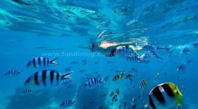 浮潜装备一般都是免费租借的。柔美的蓝天,五彩斑斓的沙子、礁石、珊瑚,在阳光的折射下,海水变得五颜六色。在海里,和你一起游的除了鱼还有只在电视上才看到过的十字海星、小海马、虎皮斑纹贝。也许你会以为是掉进了水族馆里,但这些都真实地呈现在眼前。