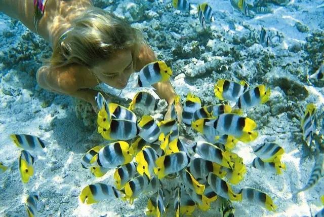 由于有着天然珊瑚礁长堤的护卫,这里浪很小,鱼儿在珊瑚礁中毫无顾忌地生长。带上鱼食,戴好浮潜装备,纵身蓝色怀抱,就有无数的鱼儿围着你打转。海水非常清澈,在水下可以看到射入海底的缕缕阳光,水下的一切都是那么清楚,美丽的珊瑚礁,与人共舞的鱼群,都看得清清楚楚。